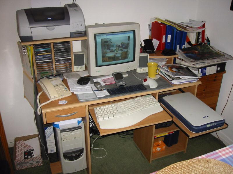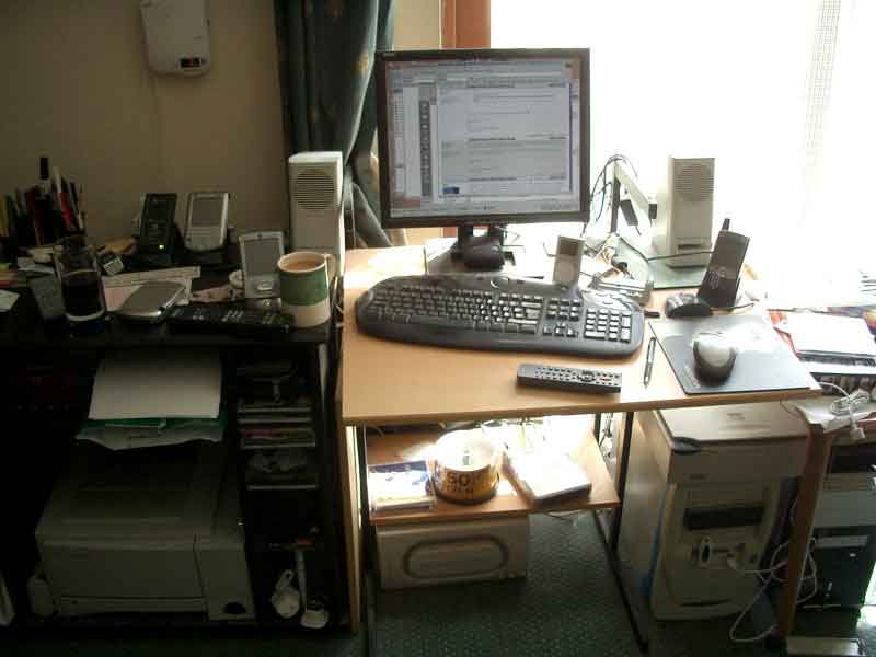 Three cradled PalmOne PDAs and a PowerToGo sled mark the periphery about the Dell 17" flat screen, jockeying for space with a mug of tea. An iPod Mini neighbours an Exilim cradle, empty of course because the Exilim is busy taking the photo. The value of wireless peripherals is clearly demonstrated by a Logitech wireless keyboard and mouse positioned mere inches away from the radio pod. Below lurks an HP laser printer, a generic subwoofer and a custom-built PC (and its backup neighbour). The eagle-eyed may spot international power adaptors, a battery-powered USB port, bluetooth dongle and an extra IPOD cable for the Mini's big brother, which spends most of its time hooked up to the HiFi.