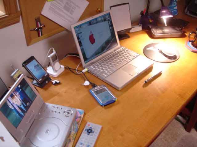 Picture taken with my Sony Cybershot T1. Included on my desk is a PalmOne Zire 72, Sony Clie TH-55, Apple PowerBook G4 12" (80GB, 512MB, Superdrive, with 1 Cupertino Ave displayed), Apple iPod Mini w/ Docking, Motorola T-720 phone with Spongebob Squarepants Faceplate, a series of WaterField bags, a Polaroid DVD player (playing CSI:Miami), Brando TH-55 case, Brando iPod Mini case, Sony Cybershot Lifestyle case, and of course a genuine blue/white swirl Lava Lamp! All of this setting on Ethan Allen furniture! Only the best for the best....