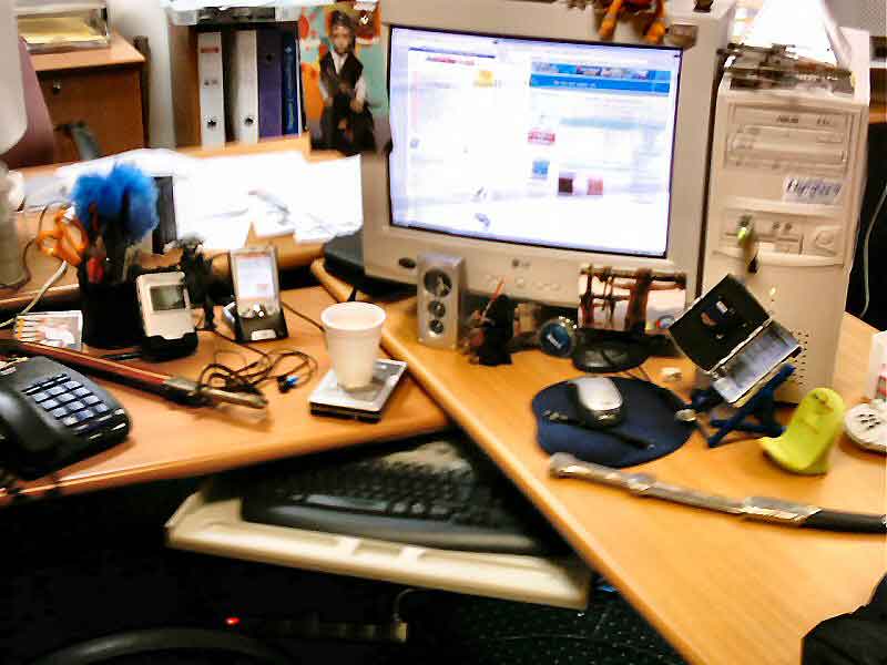 From right to left we have the following: My desk phone, a spare desk sword, my Creative Nomad Zen xtra (40Gig), the Alien, my iPaq h2210, a half empty cup of coffee resting on the first HD I ever blue screened (624MB), a picture of my son portraying Capt. Jack Sparrow as he was at age 5, my 21 inch LG monitor, Animal, a clock set to the time in Minneapolis (no reason), Darth Maul, my Microsoft Wireless Keyboard (under desk), a Dell yoyo (Dude, it's a yoyo), a picture of Graham Chapman dying for our sins, a piece of the Western Wall, my Microsoft wireless desktop mouse and receiver (over desk), my desktop PC (2.4Gig P4 running W2K Pro with 1 Gig RAM and a T1 hookup), a SanDisk Cruser Disk on Key (256MB), an X-Wing, my Tungsten E in an Innopocket Hardcase (laptop replacement), my primary desk sword (always go with silver, hardware engineers are allergic to it) and my mobile phone chair (a Moto T720).