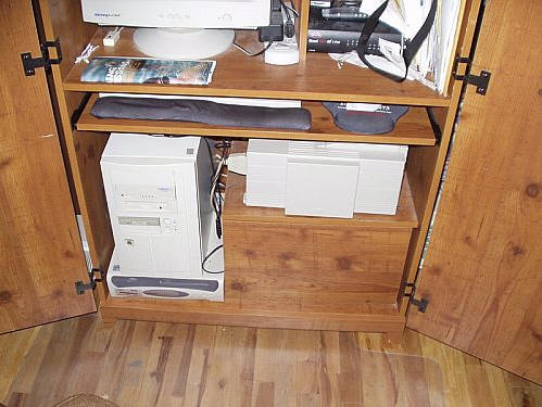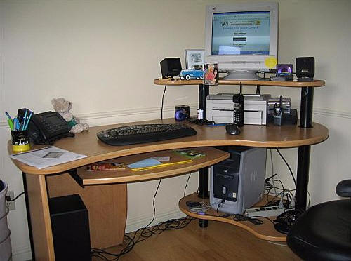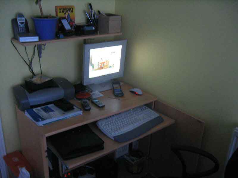 My computer used to be in the attic, and I had 2 large desks spread out with junk (I also build robots as a hobby, so imageone a desk full of wires and soldering irons). When my wife was pregnant she complained that it was like climbing Mount Everest to get to the computer, so we moved it into the back room, which is the picture you now see. I was told I wan't allowed my swivel chair in there under pain of death so I've had to use one from the dining room, it's not very comfortable for long periods, but I suppose that's a good thing.