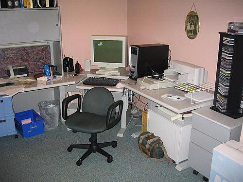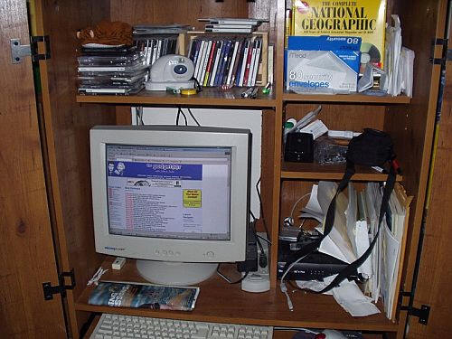 Main work space, keyboard and mouse partially stowed. All machines are getting a little long in the tooth but functional. I use the Belkin Omniview so that I can have a separate 'kids' machine running '98 for games. Cradles for the my/wife's/11 year old's Palms are on the middle shelf. Way to much paperwork stuffed into odd corners. Does anybody have a paperless office?