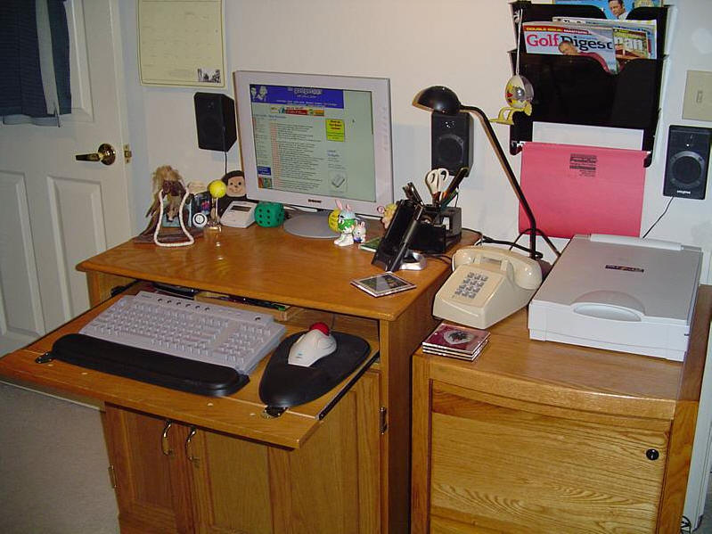This is my shuttle S51 with 2.6 Pentium, 512 mem, Radeon 9600se, and SoundBlaster Audigy. Also a MAG 17 inch monitor with a Smart multimedia keyboard. My printer is a Epson R300 stylus. The laptop is a IBM ThinkPad R32 1.6 Pentium 4 mobile and 1 gig of memory. I use the shuttle for downloading and burning disc while the laptop does all the web surfing, emailing, chatting and not to mention artwork with Adobe Photoshop. Thank you for the opportunity to show my space and after showing my wife the others she can stop complaining to me about overkill. LOL. In closing I would also like to mention how much I enjoy your site and the informative reviews. Keep up the good work.