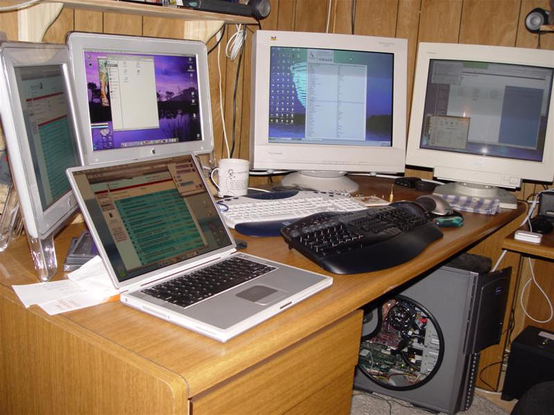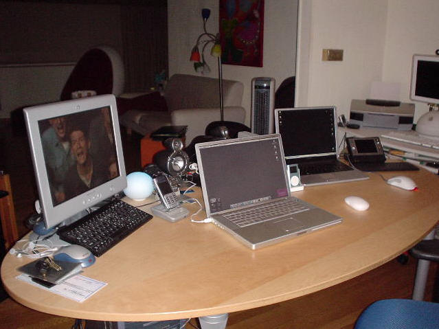 you will notice my 12 inch powerbook revision b, with superdrive, hooked up to an 18 inch lcd as my primary monitor in dual desktop mode, as well as an external 200g maxtor onetouch drive 200g via firewire for video editing, also a bluetooth wireless mouse. you will notice a pc (celeron 2.2 ghz emachines) hooked up to 17 inch lcd.