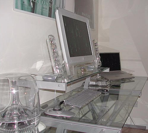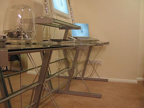 We usually work on the dining table. My computer is the Powerbook, my girlfriend's is the 12" iBook. Our friend owns that 14" iBook. They have names too: (L-R) Ivy, Chips, and Phoebe.