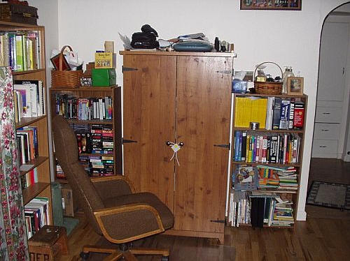 Well, here it is. All closed up with the baby lock installed. RioVolt SP250 on top for escape music. Hiding behind the SP250 is the 802.11b router and cable modem. Linux manuals and MCSE manuals with baby books right under them. The silver cylinder in front of the national Geographics is Duct tape. Handy for controlling the older child. :)