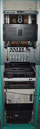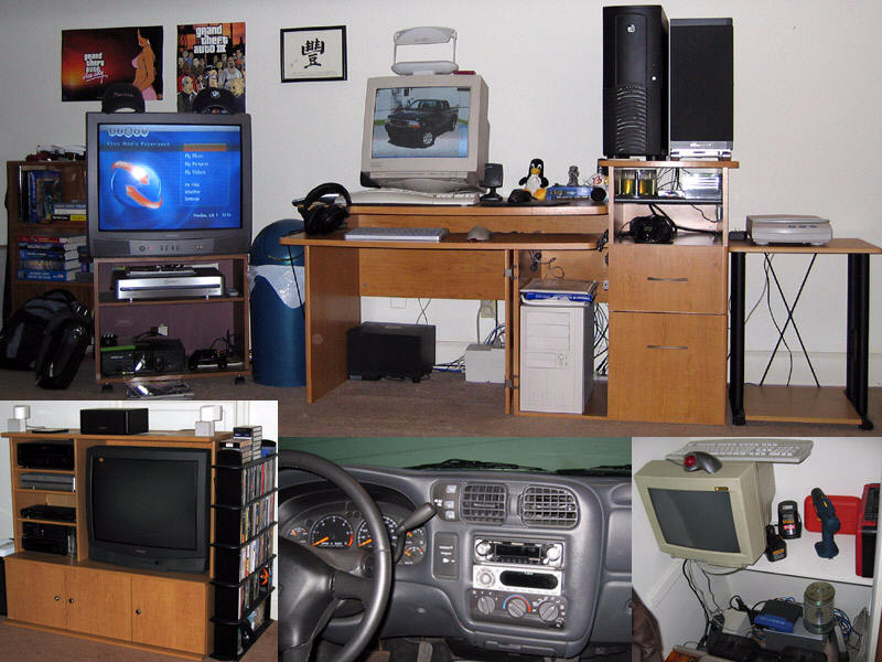 P4-3.0GHz | 1MB L2 | 800FSB, 1GB, 160GB RAID1 S-ATA, Radeon 9600 (right-side system) P3-850MHz, 512MB, 70GB ATA-133, AIW Radeon (left-side system) Celeron 566MHz, 256MB, 40GB Linux system (bottom system) P3-600MHz, 256MB, 30GB laptop (in case next to TV) ReplayTV & modded Xbox running Xbox Media Center for watching downloaded movies & TV shows. Also great for playing emulated SNES games :) Rio Nitrus MP3 player, Sandisk CF reader, Linksys router, scanner, etc...