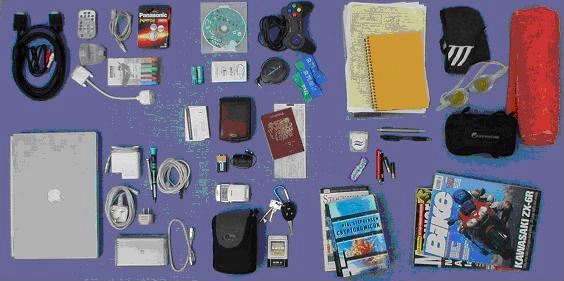 I sometimes lecture overseas, and so entertainment for long trips comes in the form of a couple of game CDs with Gravis USB Gamepad, an MP3 player, a novel and some magazines. Also in there is my swimming kit and a washbag. My Palm Vx is in its Vaja wallet case and next to it is a Brando emergency charger and battery. Other obvious stuff includes tickets, passport, cell phone, keys, business cards, earplugs, dental floss, gum a small torch with batteries, pens, a notepad and some paperwork.