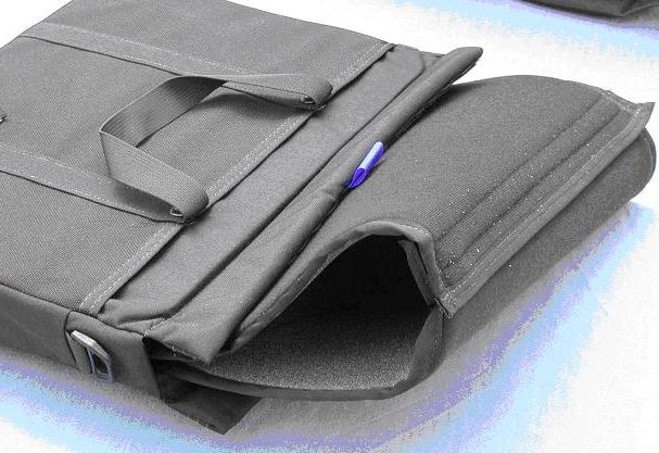 The Brain Cell is a small bag by itself and has its own carry handles and eyes for attaching the shoulder strap. There is also a large pocket that could hold a magazine or two. The Brain Cell looks, at first glance just like a rugged padded cell. However, on closer inspection an interesting feature is revealed.